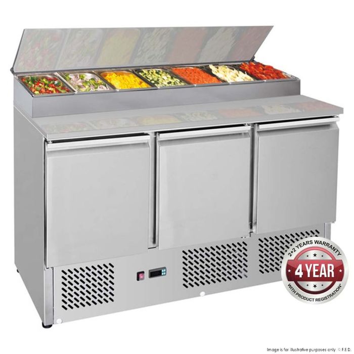 - THERMASTER 3 DOOR SALAD PREP TOP FRIDGE - TAKES 7 X 1/3 SIZE GN PAN - 150MM DEEP ( GNS1300D ) - EACH ( SPECIAL ORDER FREIGHT APPLIES )