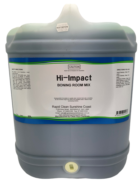 Biodegradable formulation to rapidly clean common food soils, emulsifies fat and removes tough soil, leaves area sparkline clean. Ideal for meat processing industry.
