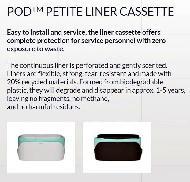 Easy to install and service, the liner cassette offers complete protection for service personnel with zero exposure to waste. The continuous liner is perforated and gently scented. Liners are flexible, strong, tear-resistant and made with 20% recycled materials. Formed from biodegradable plastic, they will degrade and disappear in approx. 1-5 years, leaving no fragments, no methane, and no harmful residues.