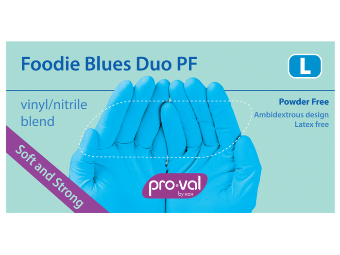 - PRO-VAL FOODIE BLUES DUO PF GLOVES - LARGE - BLUE VINYL / NITRILE BLEND - 100 - PKT