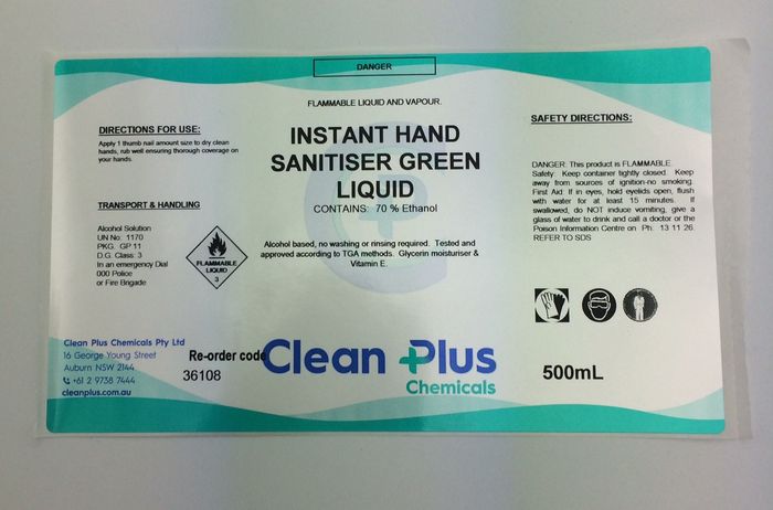 - CLEAN PLUS Instant Hand Sanitiser Green Liquid Label - EACH